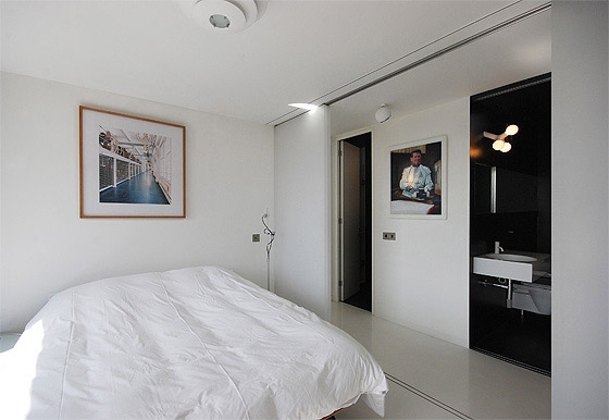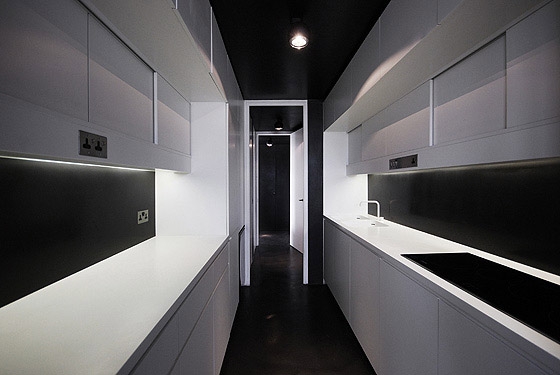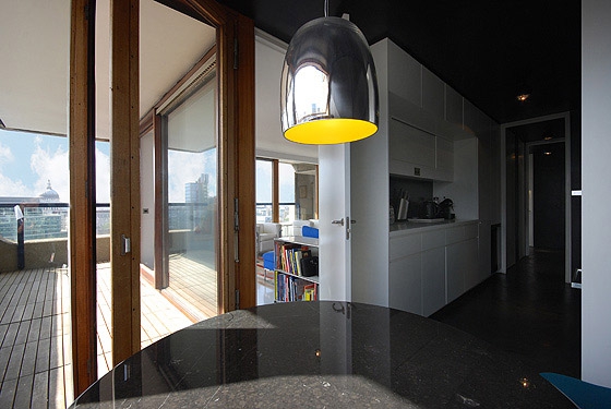 REFURBISHMENT OF A LISTED TOWER APARTMENT The flat is located above the city of London, only a short walk from the financial district amidst a on first sight, rough concrete oasis - the listed Barbican Centre. There is no traffic, instead ponds, gardens and a distinguished cultural centre on the ground level, including a concert hall, theatres, art galleries and cinemas. The 100 m² flat on the 17th floor of the Shakespeare Tower with spectacular view over the roofs of the city shall be the new residence of our client and also serve as an exhibition space. When the client purchased the flat it looked as if it was frozen in time with yellowed carpeting and the original kitchenette, albeit seemingly run down. Nevertheless the flat had a well arranged floor plan, although the corridor, kitchen and bathroom were located towards the inside of the building and therefore appeared dark and small. A Loggia stretches all around the flat. On the east side in front of the kitchen window it forms a terrace which offers unobstructed views over the skyline. From breakfast with the sunrise to an evening sunset it is only a few steps along the balcony. The flat shall become more flexible and spacious while maintaining the historic floor plan. Space for the display of contemporary art shall also be offered. The panoramic view must be visible from all corners of the flat. In order to achieve a greater lightness, the wall between the corridor and bedrooms was replaced by translucent sliding panels. Living rooms are completely coloured in white to underline their spaciousness and to form a minimalistic background for the art collection. In harsh contrast to this, the walls of the internal spaces of the corridor, bathroom and kitchen are coated with a smooth shimmering black cement finish. The dark finish allows small rooms to work larger and adds an elegance with the contrast to the white fixtures. The structure of the flat with its three layers becomes visible: the outside loggia, the white living rooms and the bathroom and kitchen completely wrapped in black. The solid wall between the bathroom and corridor was also removed and replaced by translucent sliding doors. When open, the owner can enjoy the panoramic view while soaking in the bathtub. If the balcony doors are also open, the gentle rumble of the metropolis can also be heard. The Barbican Estate was built between 1965 and 1976, on a site that was bombed in World War II.The complex was designed by the architects Chamberlin, Powell and Bon. The estate was officially opened in 1969 and is now home to around 4,000 people living in 2,014 flats. The flats reflect the widespread use in Britain in the 1960s and 1970s of concrete as the visible face of the building. "The intention underlying our design is to create a coherent residential precinct in which people can live both conveniently and with pleasure. Despite its high density the layout is spacious: the buildings and the space between them are composed in such a way as to create a clear sense of order without monotony. Uninterrupted by road traffic (which is kept separate from pedestrian circulation through and about the neighbourhood) a quiet precinct will be created in which people will be able to move about freely enjoying constantly changing perspectives or terraces, lawns, trees and flowers seen against the background or the new buildings or reflected in the ornamental lake." Chamberlin, Powell & Bon, Architects "Barbican Redevelopment" April 1959