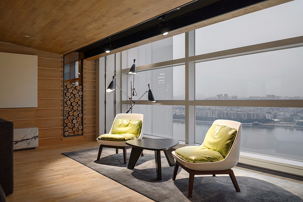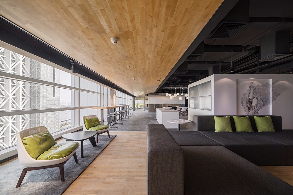 会议室空间宽阔,两边江景映入眼帘,空间色调以灰色和白色为主,再融入绿色的清新和木色的自然。创新的工作及休闲模式,黑色的包容,表达了保利集团的沉稳;跳跃的色系搭配,爆发的是创新的想法。在仿若浩瀚星空的设计中,保利(横琴)创新产业投资管理有限公司办公室展现出了积聚的力量,带给使用者无限的想象和发挥空间,创造更多潜在的商机。