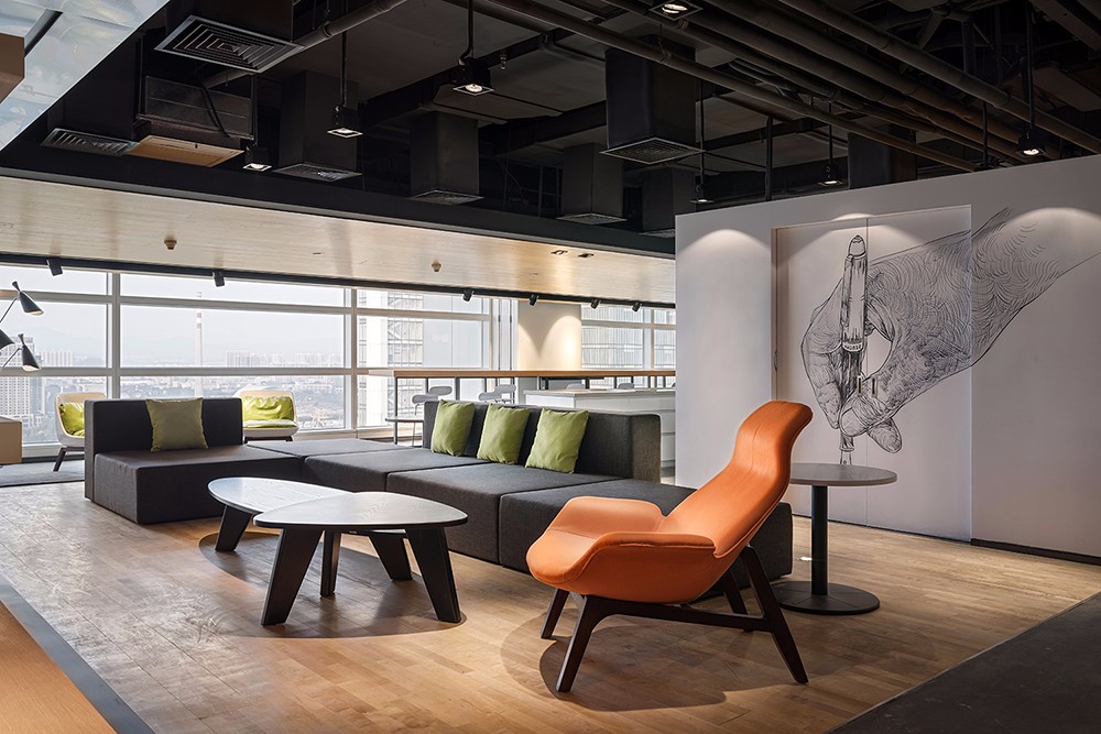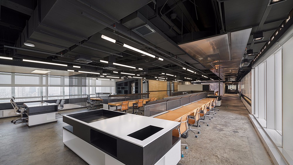 根据功能区的划分嵌入不同的色系,则能获得跳跃活力的视觉感受和想象力;落地玻璃和灯具带来充足适宜光线,材质温和、色彩鲜亮的家具又令人涌现无限灵感。半封闭的天花和水泥色般的地板相互带出些许工业感,搭配木色、橙色的办公家具,个性化的构思,为办公者增添一份动力展现。