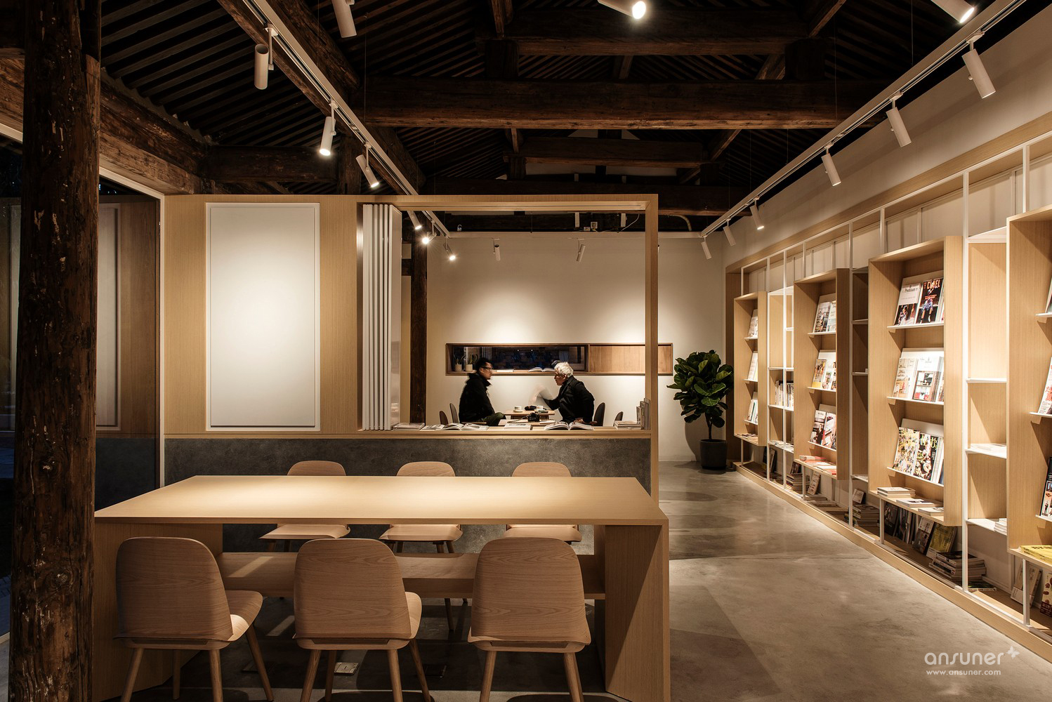 在灰色水磨石的连接下,沿河的立面用节奏较为舒缓的矩形体块排布开来。其中主入口连接了室内吧台区域,将它们组合在一个盒子当中嵌入房间,形成了简洁明确的功能划分。为书籍展示和阅读讨论设计的大工作桌放置于敞亮的玻璃窗旁,停留在此能感受饱满和谐的阳光和窗外恰到好处的小河垂柳。西侧格栅折叠窗设计巧妙地在回应传统装饰语言的同时也可用于夏日遮阳。