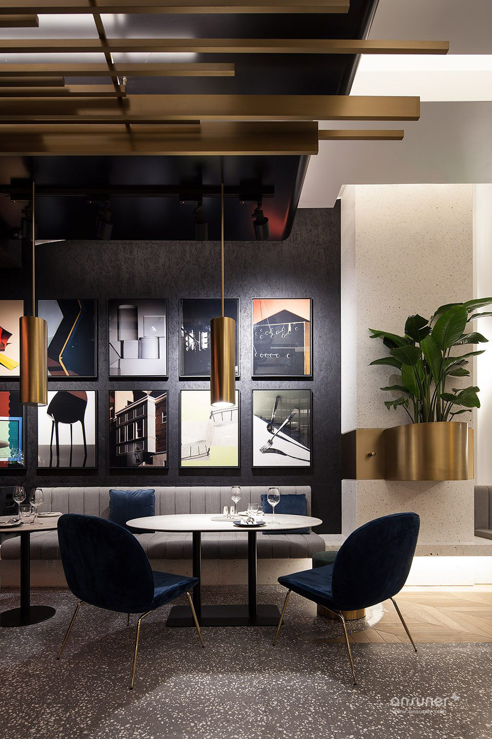 也正是在此时此刻,协调亚洲所设计的另一个设计亮点才得以真正突显出来:从门框到灯具的金色黄铜装饰,衬托出暖融,慵懒与奢华的气氛。伴随着现代感的音乐旋律,装饰镜面放大的室内效果,餐厅从内而外散发出诱人的光芒,吸引着顾客进入这个空间来。