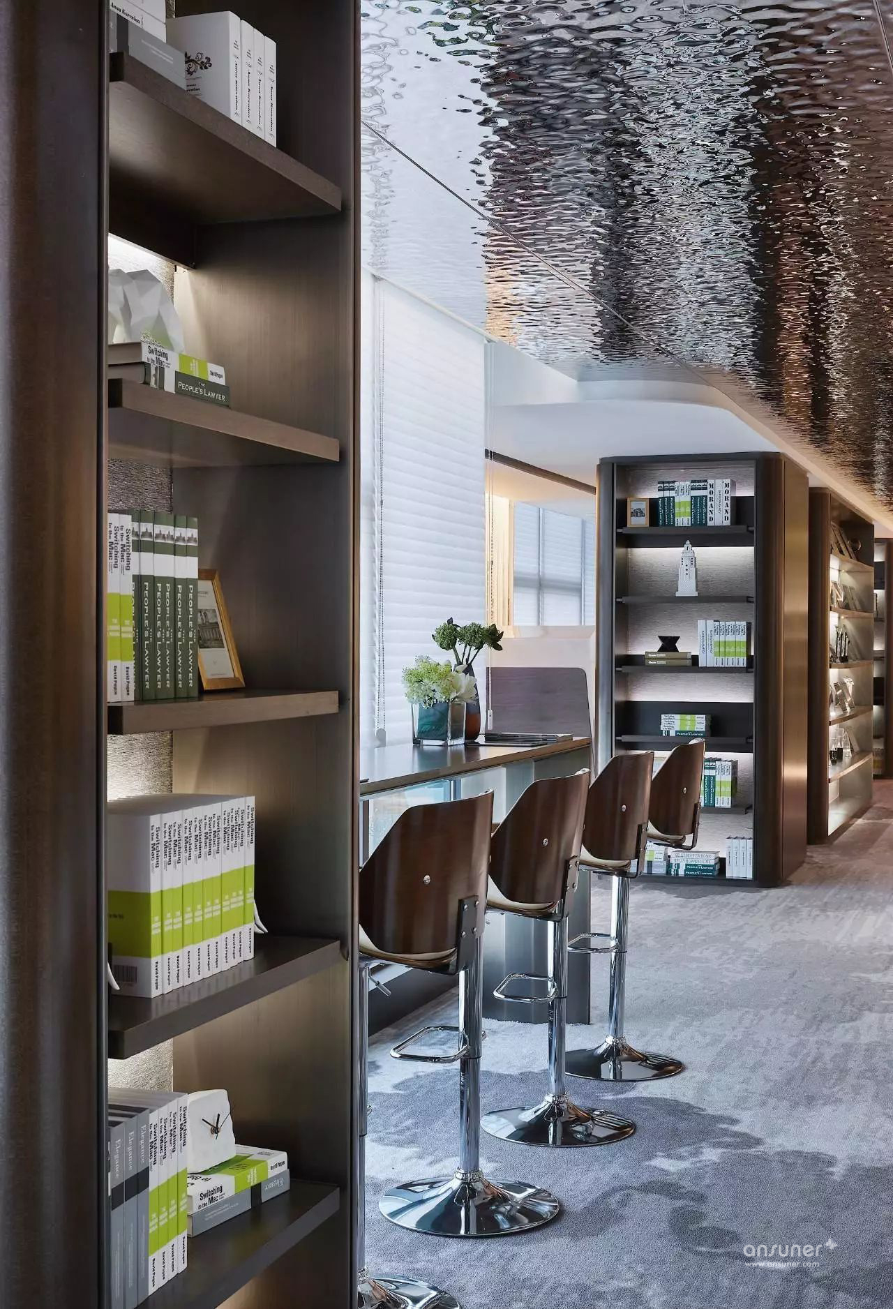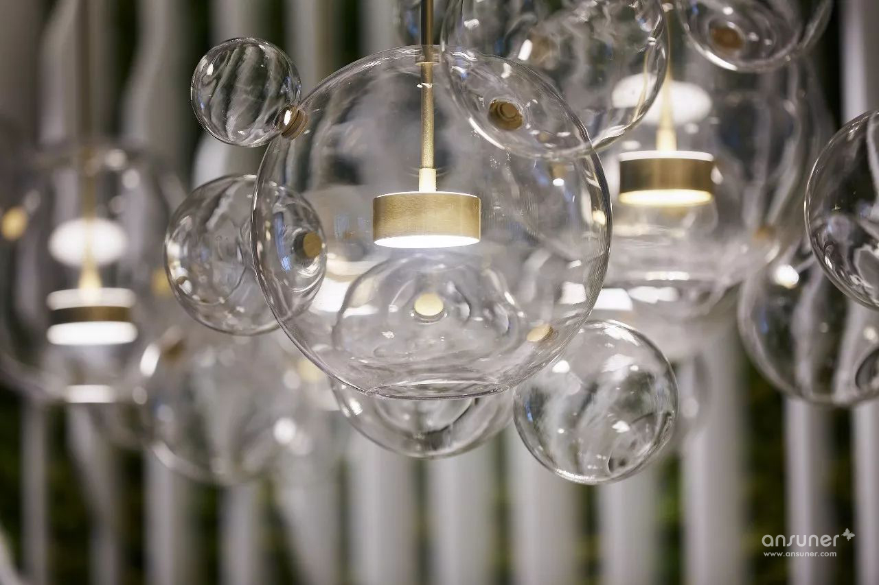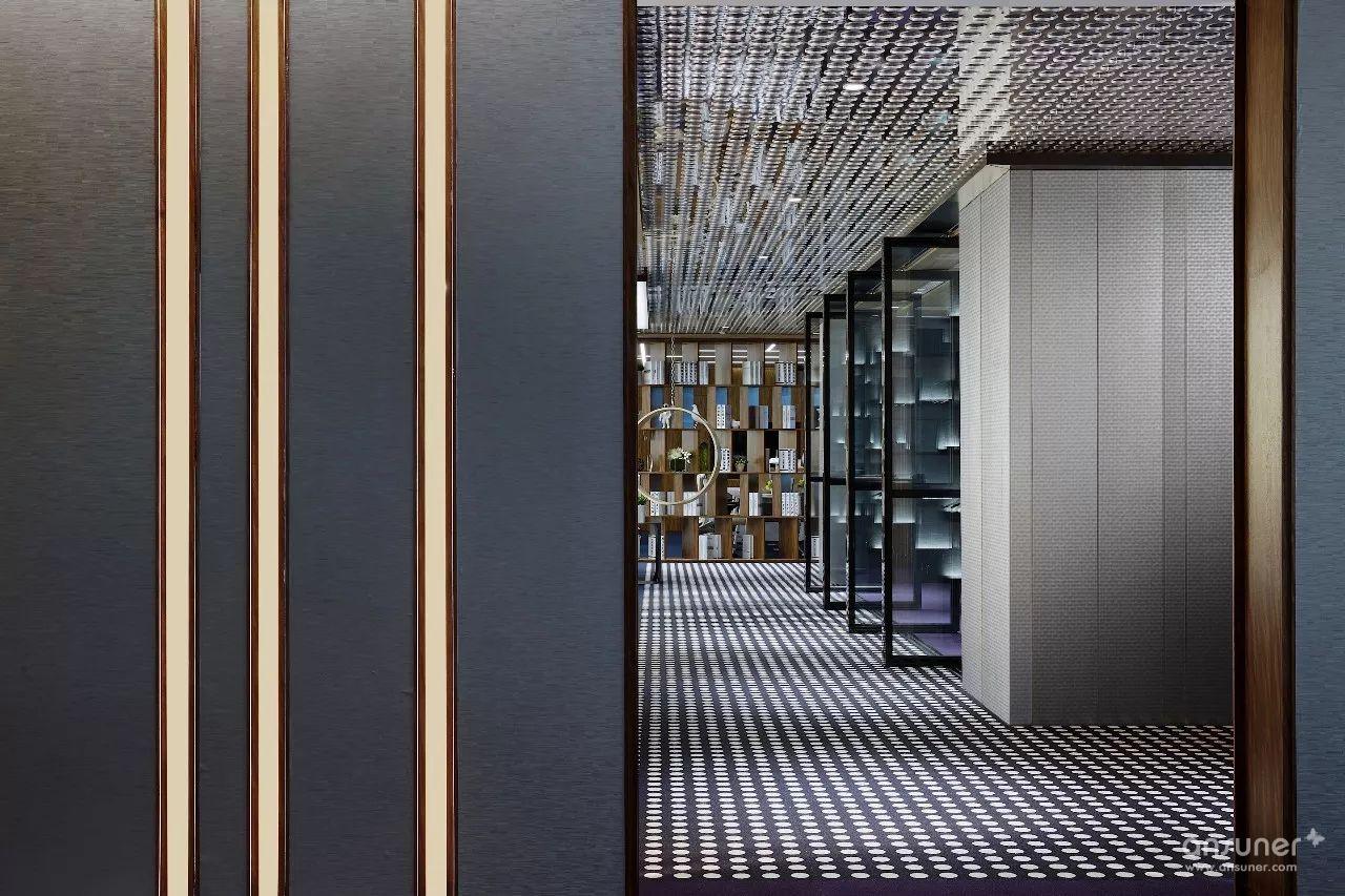 室内设计沿用原建筑设计的“山水城市”概念,配合技术创新,构筑一个都市中的逆世界,天花顶部似水,墙面线型为山,地面像漂浮着的云朵的地毯,融入自然生态美学,打破传统室内空间的固有形态,营造逆空间的独特视觉效果。