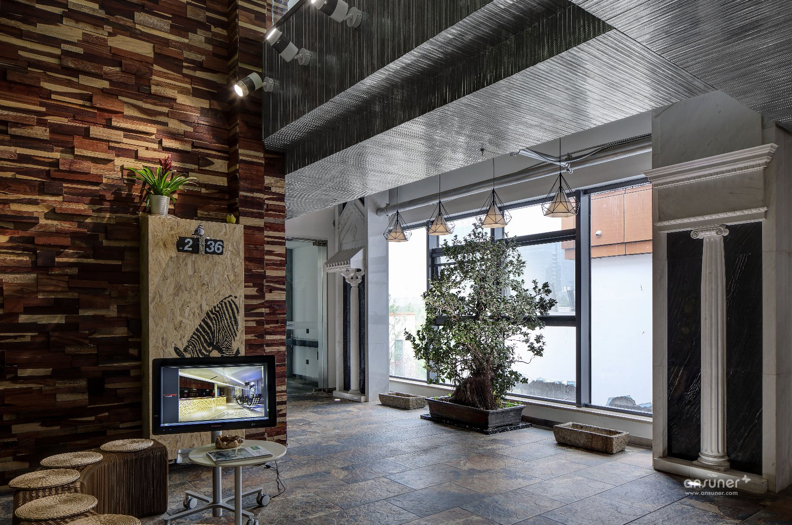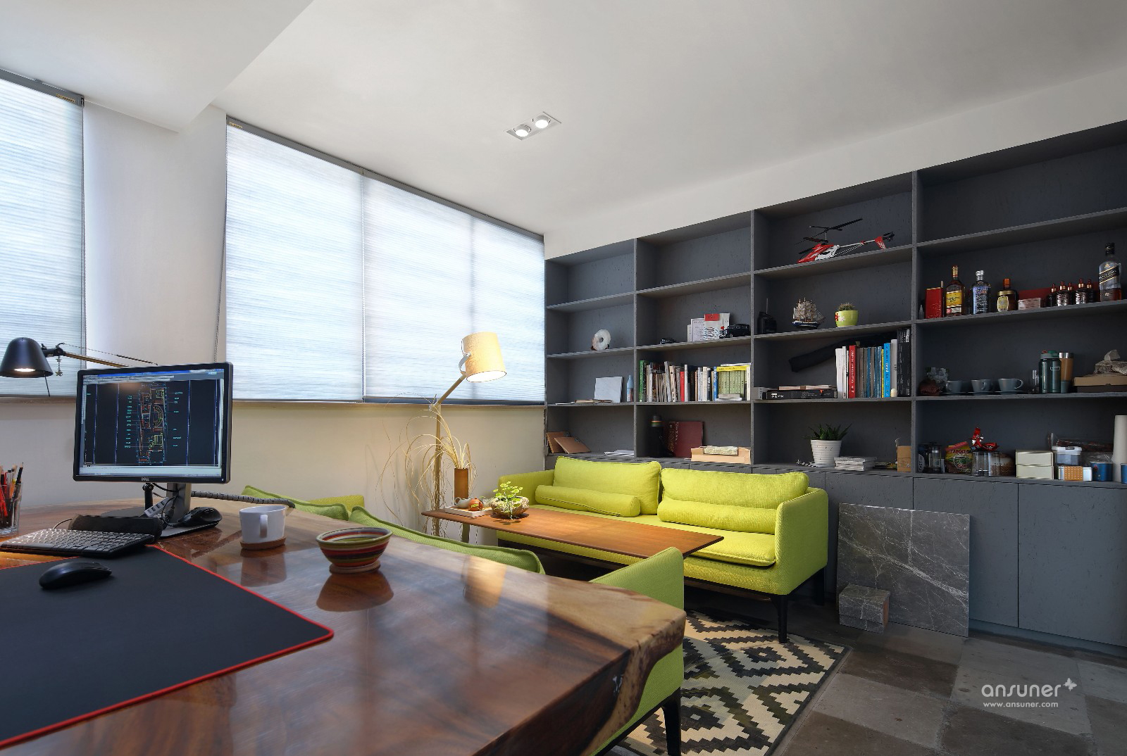 各种文化的碰撞,各种材质的尝试,尤其是废旧材料的利用,讲究环保与节能,绿色装修,自然古朴。会议区与交通区域融合,达到节约空间的目的。公司LOGO背景寓意为设计师通过敏捷的设计能力,让思想闪光。